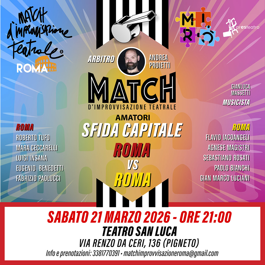 Sabato 21 marzo 2026, SFIDA CAPITALE: Match di Improvvisazione Teatrale Roma vs Roma, categoria Amatori.